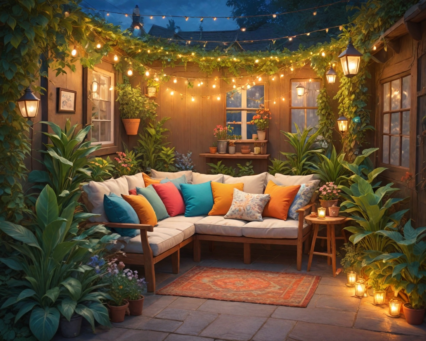 A iluminação cria ambientes convidativos e destaca elementos específicos. Use luzes de chão, lanternas pendentes e iluminação solar para criar camadas e um ambiente acolhedor.